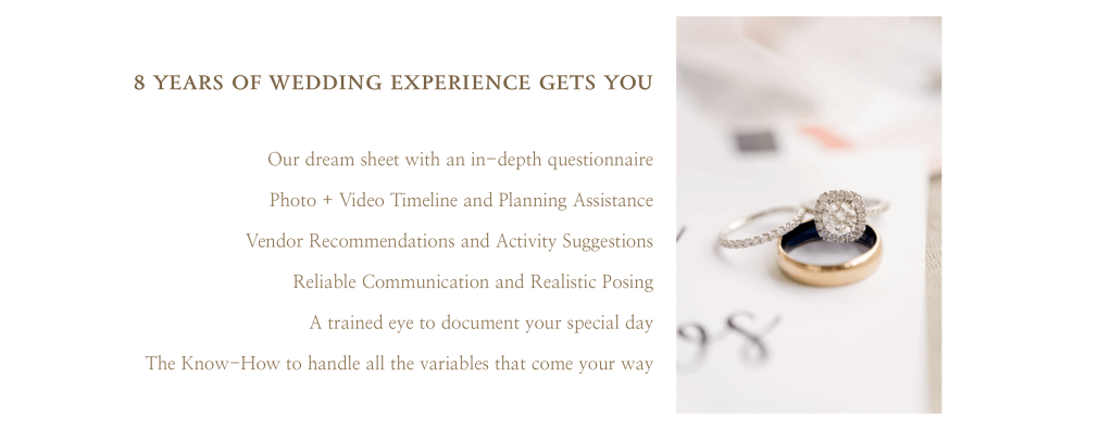 Our dream sheet with an in-depth questionnairePhoto + Video Timeline and Planning AssistanceVendor Recommendations and Activity Suggestions